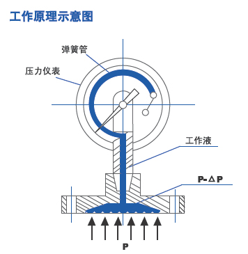 当测量介质的压力P作用于隔膜,则隔膜产生变形,压缩压力仪表测压系统的密封液,使其形成 P-△P 的压力。当隔膜的刚性足够小时,则△P也很小,压力仪表测压系统形成的压力就接近于测量介质的压力。