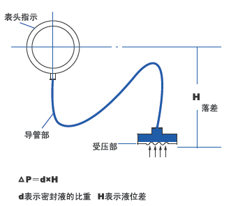 尤其对于带软管连接管的隔膜压力表,由于受压部与通用型压力表安装位置不同,会产生如下图所示的液位差的影响量△P